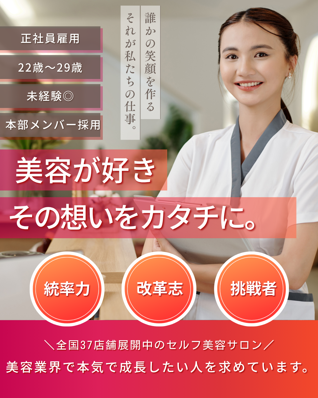 ・22歳〜29歳の男女 ※社会人経験3年必須 ※3年以上働ける方 ※年齢が対象でない方も例外採用あり |